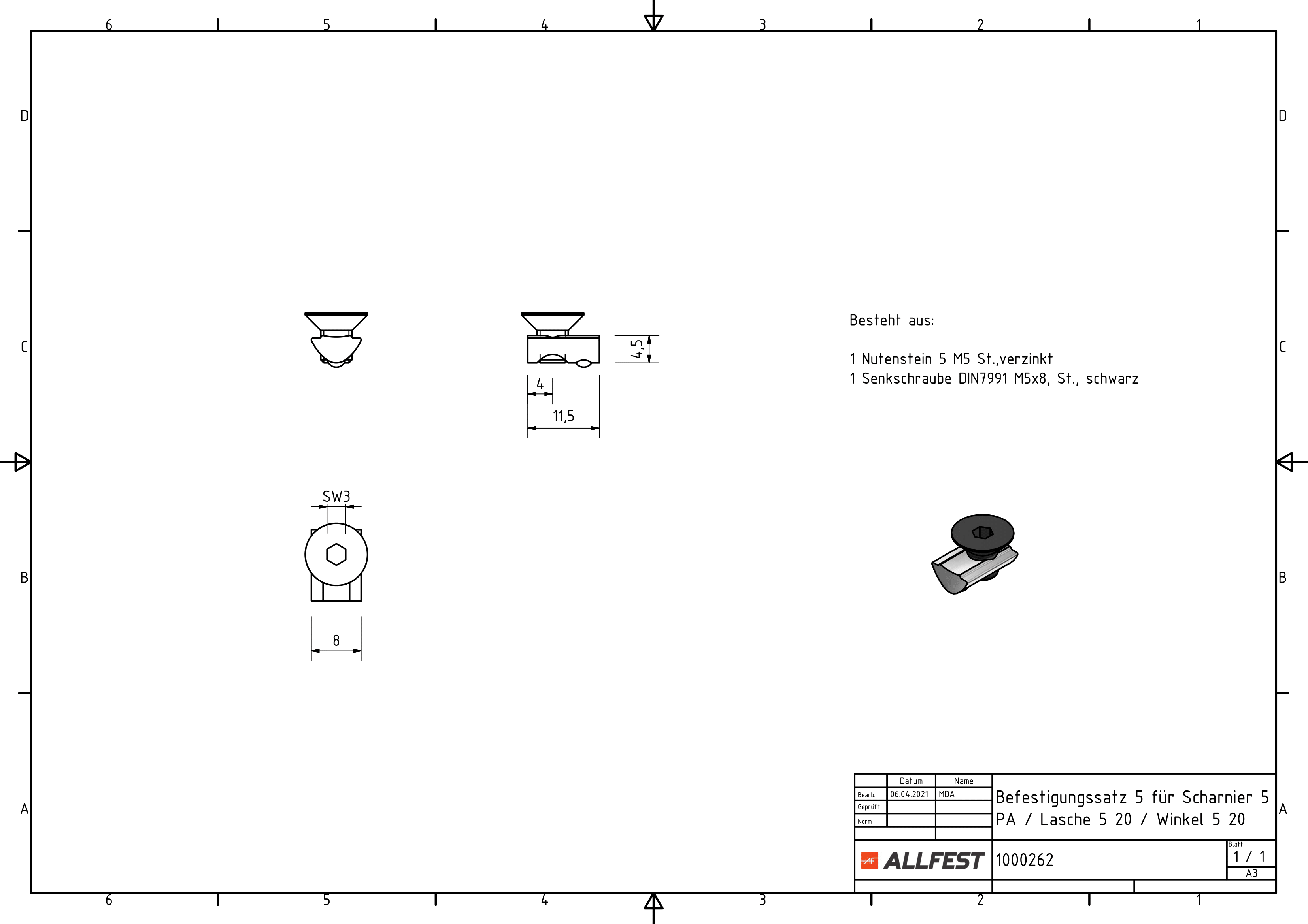 Zur Befestigung des Scharnier 5 PA und des Doppelscharnier 5 PA. Senkschraube DIN 7991 M5x8, St, schwarz.