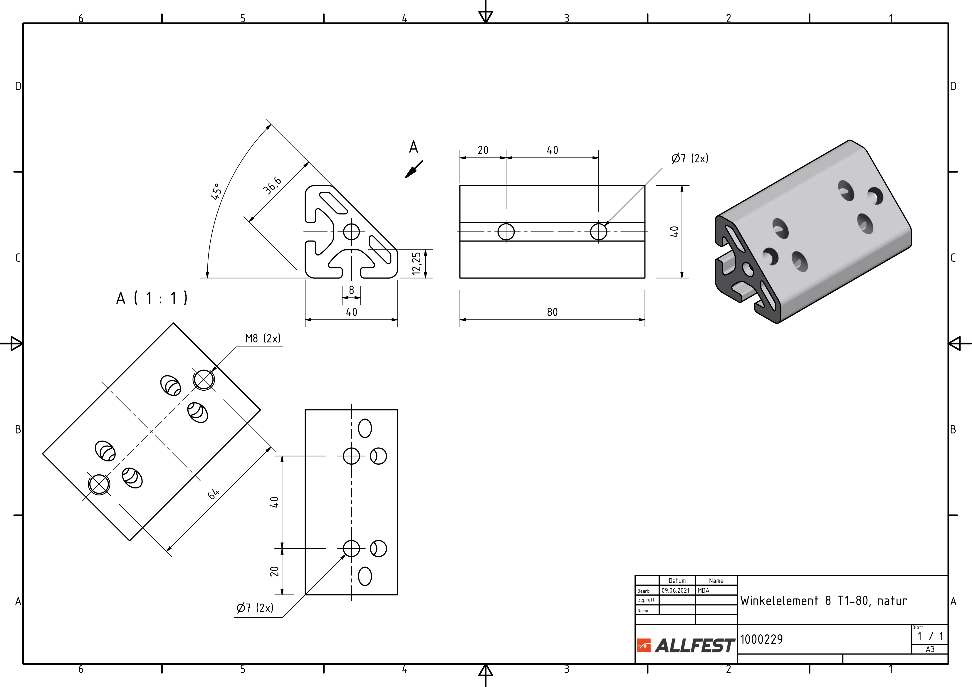 Verbindungselement für die Befestigung von einem Profil unter einem Winkel von 45°.